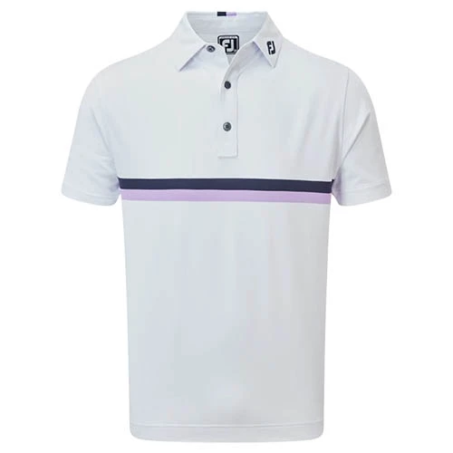 Mens FootJoy Double Chest Band Pique Golf Shirt. A stylish looking golf shirt with 3-button placket. Constructed using a technical, easy care, stretch fabric that promotes a high degree of moisture management, keeping you cool and dry on the course, whilst allowing complete ease of movement through the swing.