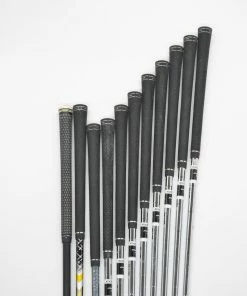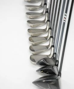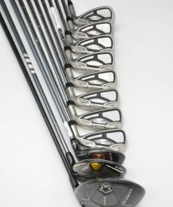 Set includes a Cobra King F8+ 11 degree Driver, a Cobra Fly-Z Fairway 3-4 Wood, a Cobra King F6 20.5 degree Hybrid, and Cobra Amp Max Irons 4-SW. Irons are in good condition with light wear to the heads and faces, with stock shafts in S-flex and stock Cobra grips.