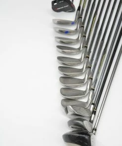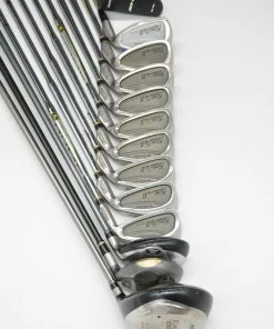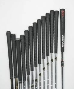 Set includes a King Cobra SS 350 9 degree Driver, a Cobra Gravity Back 7 Wood, a King Cobra Baffler 5 Hybrid, King Cobra II Tour Irons 3-SW, and a Dead Aim TW-30 34.5in. Putter. Irons are in good condition with light wear to the heads and faces, with stock grips in S-flex and Star Grip grips.