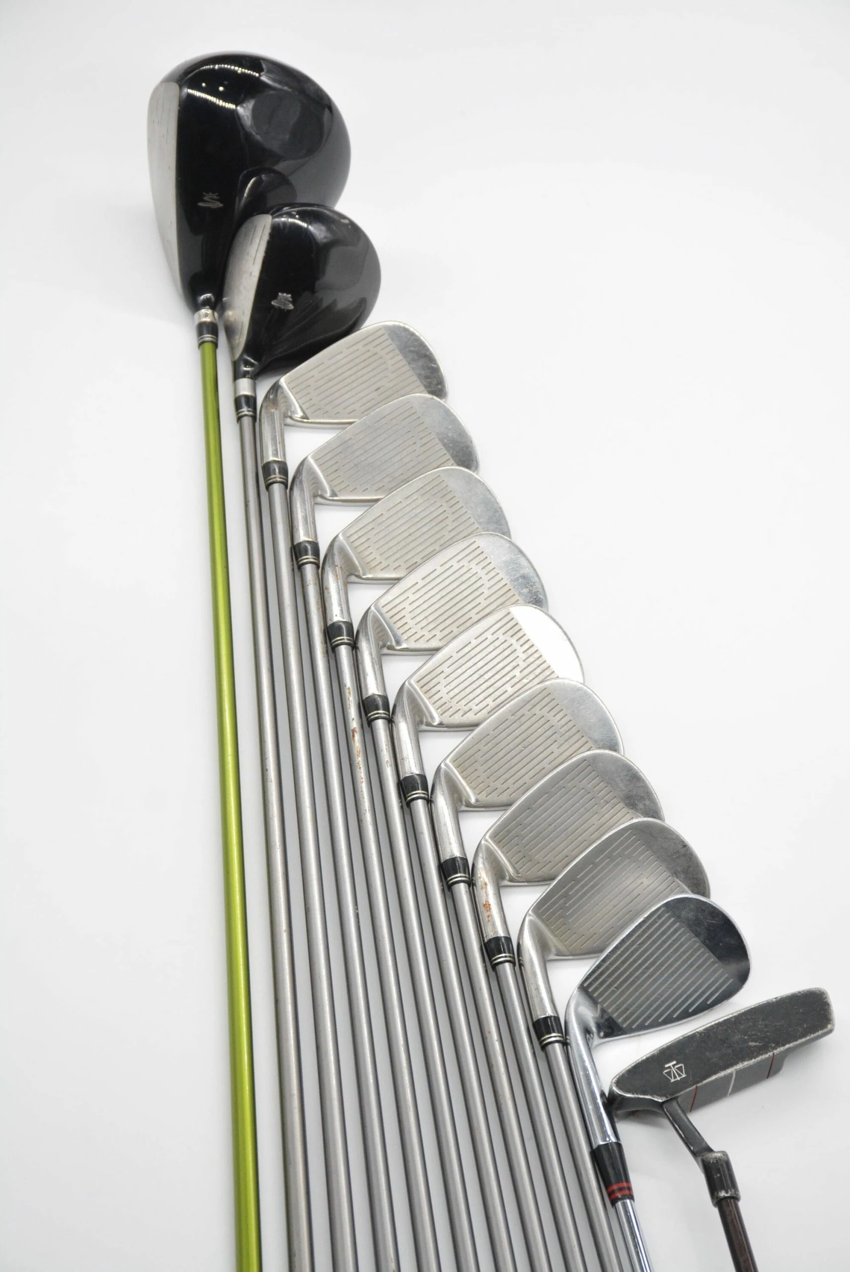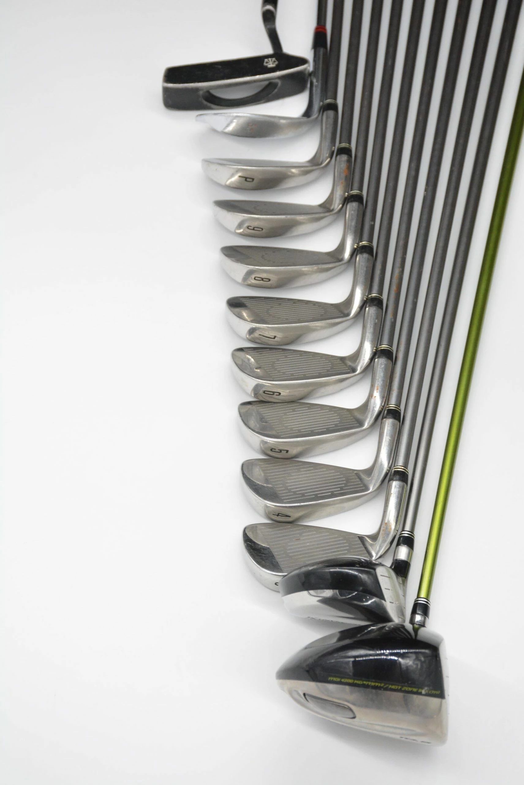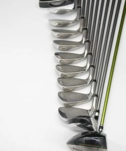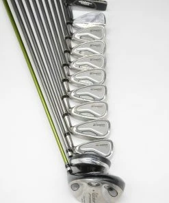 Set includes a Cobra F Speed 10.5 degree Driver, Cobra Offset SS 3 Wood, Cobra SS Oversize Irons 3-PW, Ben Hogan Riviera 56 degree Wedge, and a 35.5in Daiwa GC Probalance 6511 Putter. Irons are in good condition, with normal wear to their heads and faces. Shafts are Aldila HM Tour 75g graphite in R Flex with stock Cobra Grips. Shafts are .5in longer than standard length.